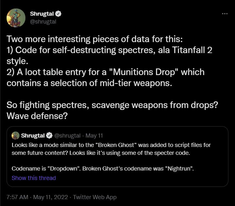 在第十三赛季更新之后,挖掘工Shrgtal在游戏文件中发现了一个PvE模式,它似乎与第五赛季的破碎幽灵(Nightrun)任务相似。