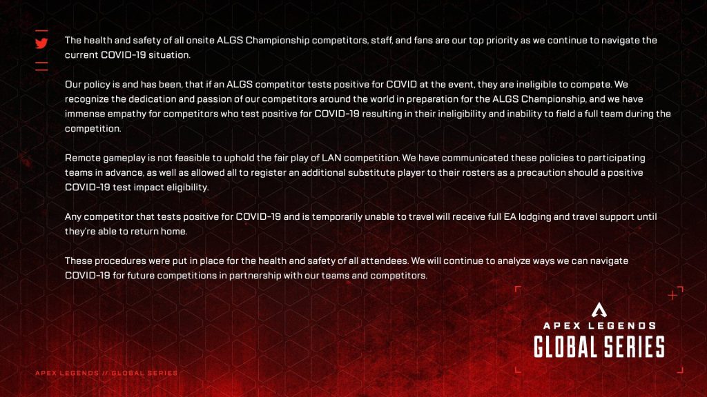 我们的策略是,如果 ALGS 的参赛者在比赛中检测出 COVID-19 呈阳性,他们就没有资格参加比赛。我们认识到世界各地的参赛者为准备 ALGS 冠军赛所付出的奉献精神和热情,我们对COVID-19检测呈阳性的参赛者深表同情,这导致他们没有资格并且无法在比赛期间组建一支完整的队伍。