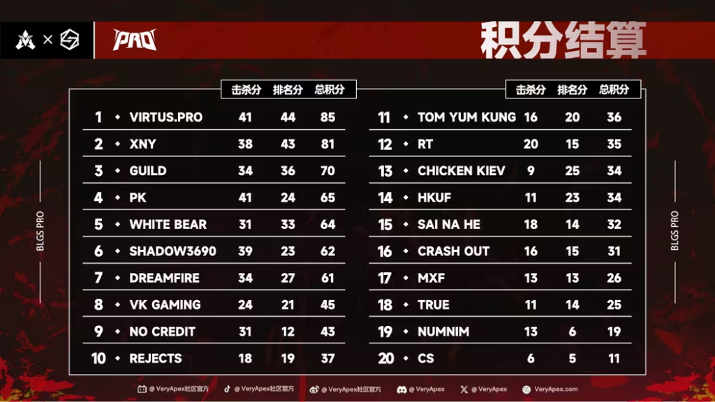 VeryApex社区- VK杯-YEAR 5 PRO训练赛#0903 BC组总排名积分:
