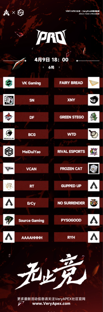 VeryApex社区- VK杯YEAR 5 PRO训练赛#0409 参赛名单如图: